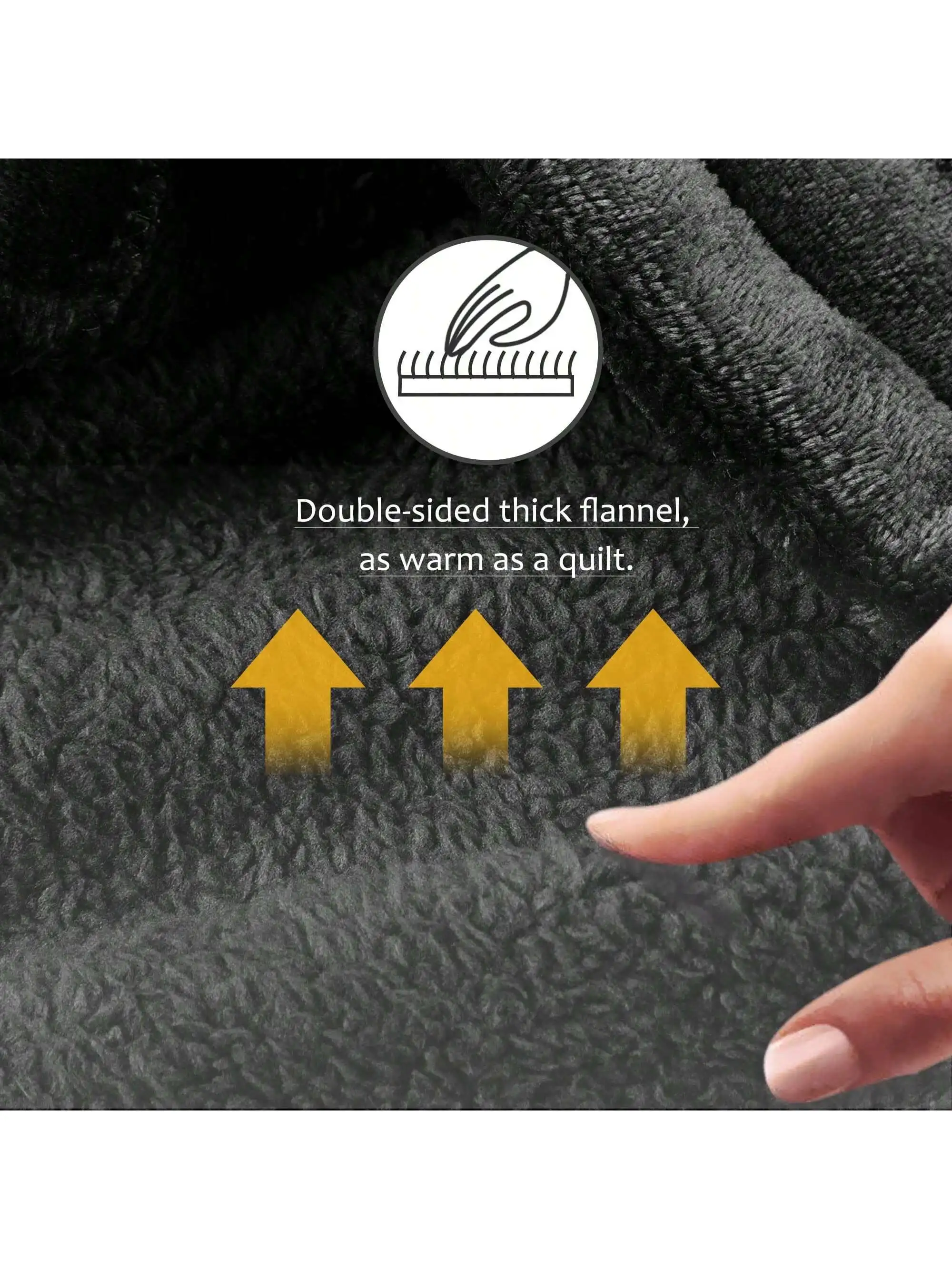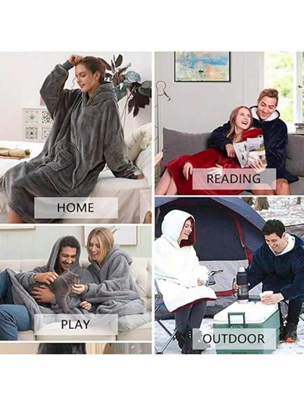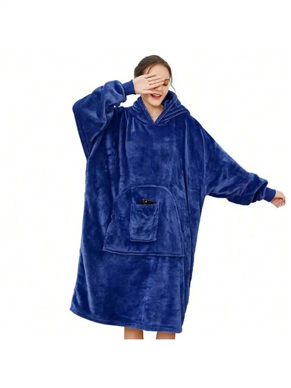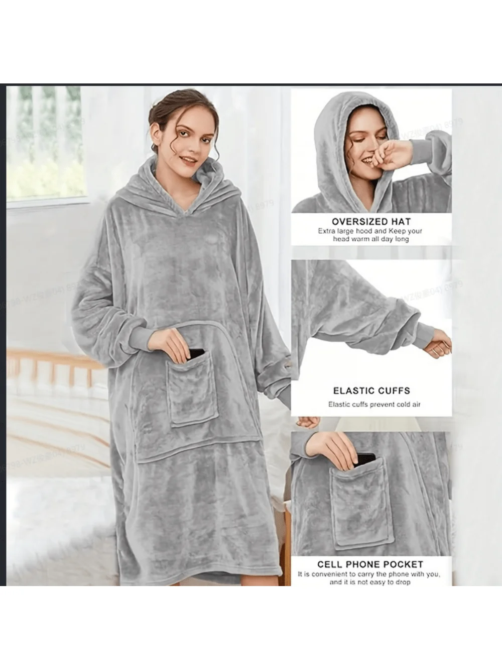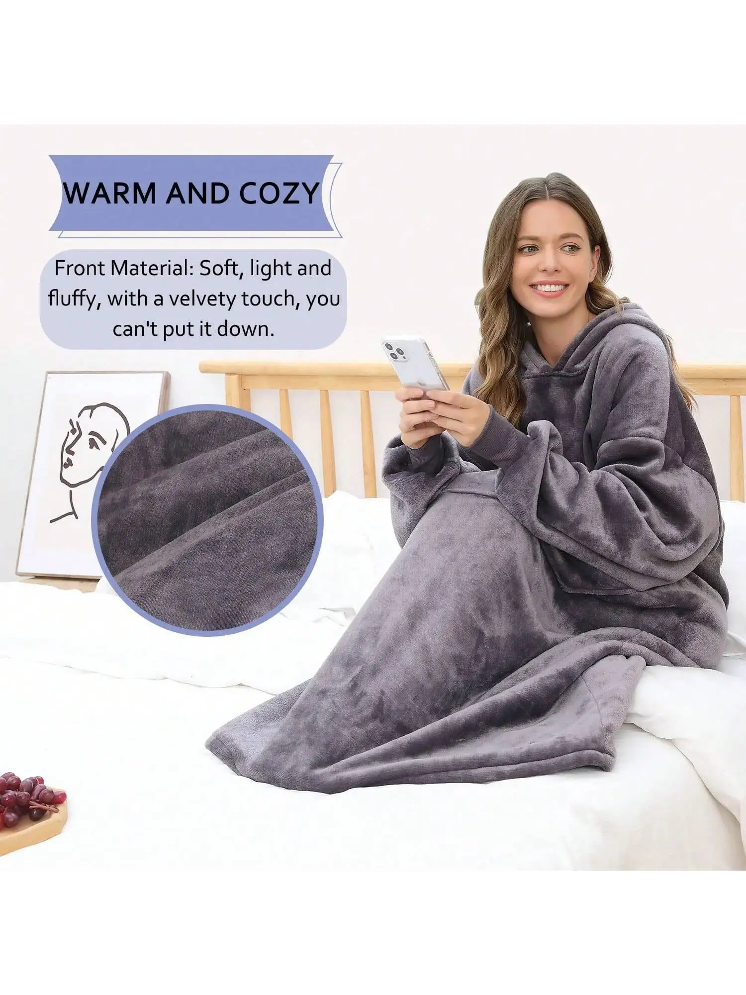 Extra-Large Wearable Blanket Outdoor Thermal Sweatshirt, Thick and Warm Flannel Hooded with Pockets and Sleeves, Adult Gift, Mid-Length Wide Hooded 145cm Loungewear